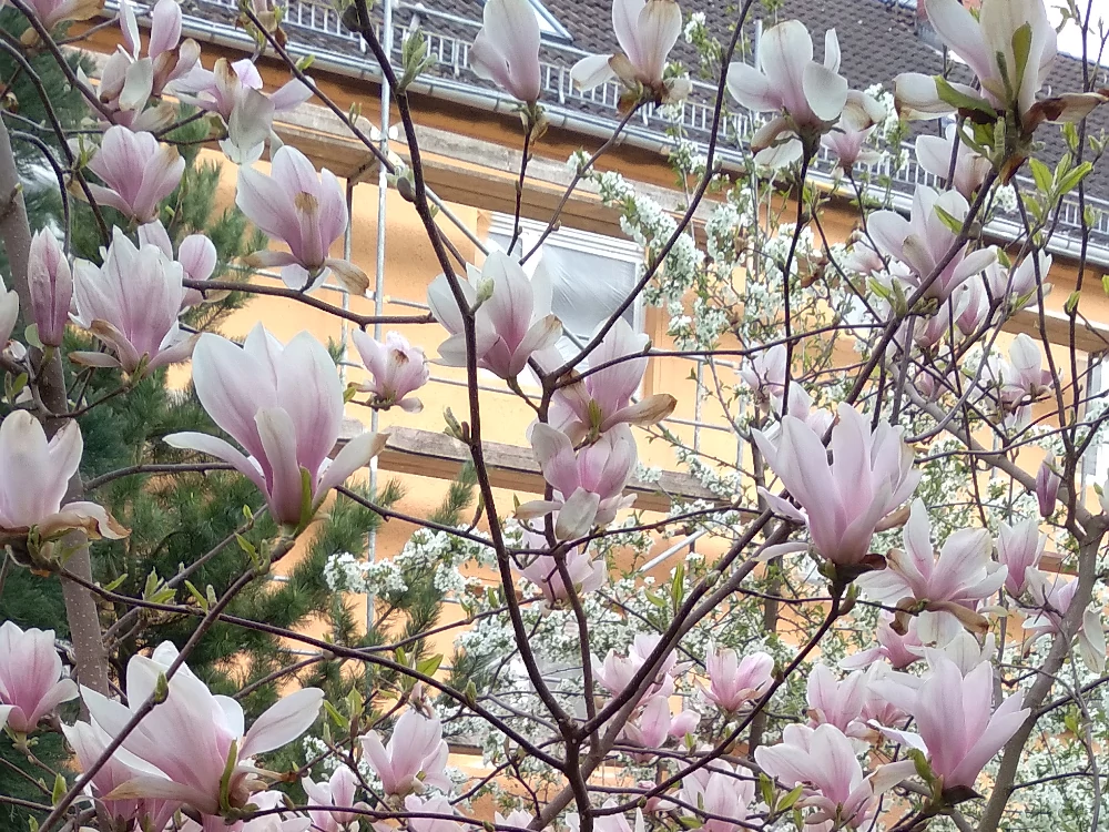 Außenbereich - Magnolie - Ferienwohnung / Monteurwohnung in Grimma. Beschreibung Außenbereich::: Die Magnolie in voller Blüte.
