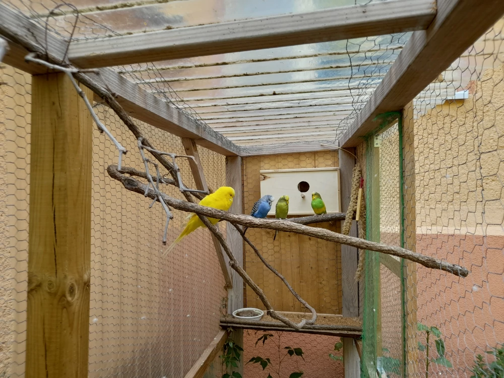 Außenbereich - Wellensittiche - Ferienwohnung / Monteurwohnung in Grimma. Beschreibung Außenbereich::: Die Wellensittiche in der Voliere.