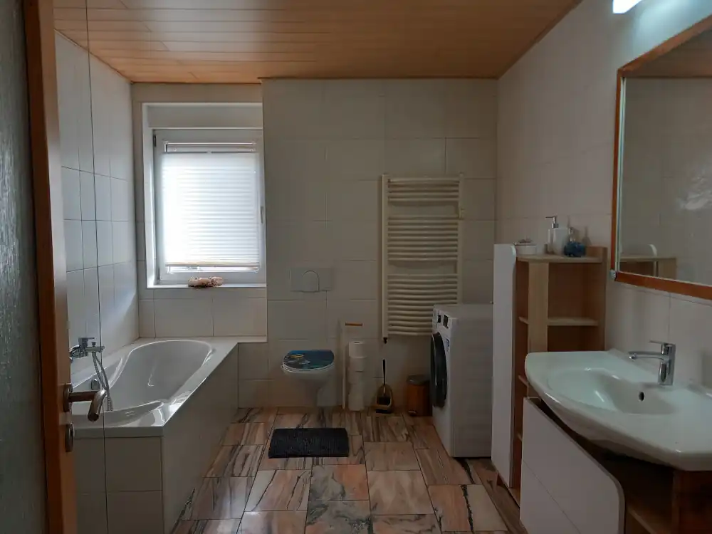 FeWo "Grünblick" - Bad 2 - Ferienwohnung / Monteurwohnung in Grimma. Beschreibung FeWo "Grünblick"::: Badezimmer mit Badewanne, Waschmaschine, Schrank und Waschbecken.