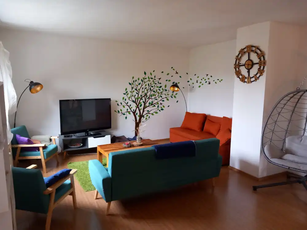 FeWo "Grünblick" - Wohnraum - Ferienwohnung / Monteurwohnung in Grimma. Beschreibung FeWo "Grünblick"::: Der Wohnraum mit 2 Couchs, Sesseln, Schaukel, Tisch und Fernseher.