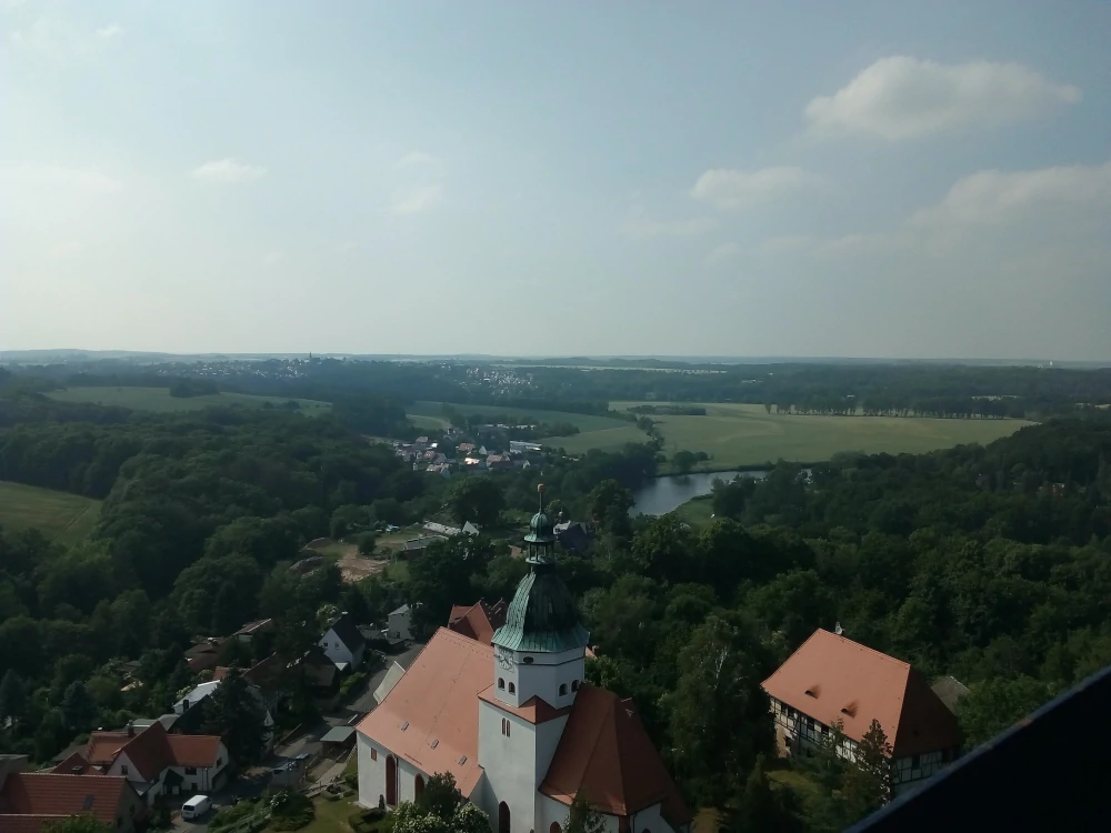 Umgebung - Dorfansicht 1 - Ferienwohnung / Monteurwohnung in Grimma. Beschreibung Umgebung::: Dorfansicht von Döben mit Kirche aus der Luft von hoch oben gesehen.